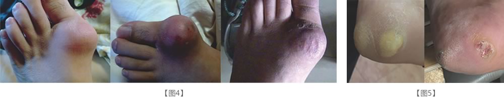 接受抗風竤治療的部分痛風患者在出現(xiàn)紅、腫、熱、痛、發(fā)燒等無菌性炎癥反應之后,痛風石隨之會出現(xiàn)明顯變軟、縮小的情,部分患者出現(xiàn)痛風石表皮積液甚至尿酸鹽從腳部和手部直接排出的現(xiàn)象【見圖4、圖5】。還有一種情況,某些患者關節(jié)四肢表面原本沒有痛風石,接受抗風竤治療 后卻在腳背或者手背鼓起軟包。這是由于關節(jié)腔內的尿酸鹽結晶快速溶解但未能及時排出引起的,堅持治療幾天后就會代謝排出體外,不必擔心。
