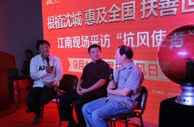 主持人江南(左)采訪抗風(fēng)使者張芮袀先生(中)