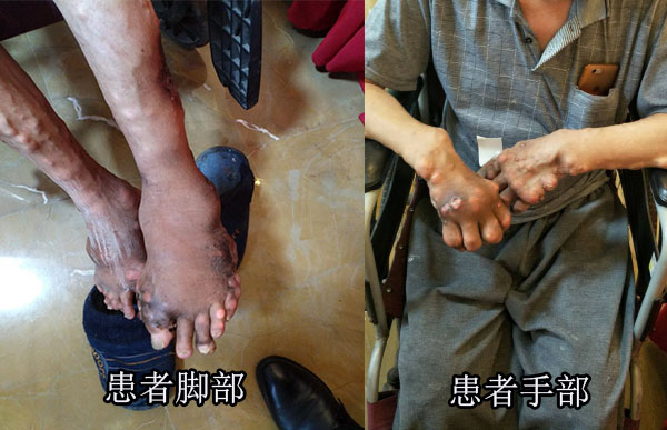 在抗風竤“全民抗痛風 公益萬里行”——重慶站活動現(xiàn)場,有這樣一位重癥痛風患者鄧先生,他是被他家人用輪椅推進來的。鄧先生渾身長滿痛風石,四肢、腳趾、腹部,甚至是耳朵都布滿“石頭”,這些密密麻麻的“石頭”小如米粒,大如雞蛋,折磨的患者痛苦不堪。