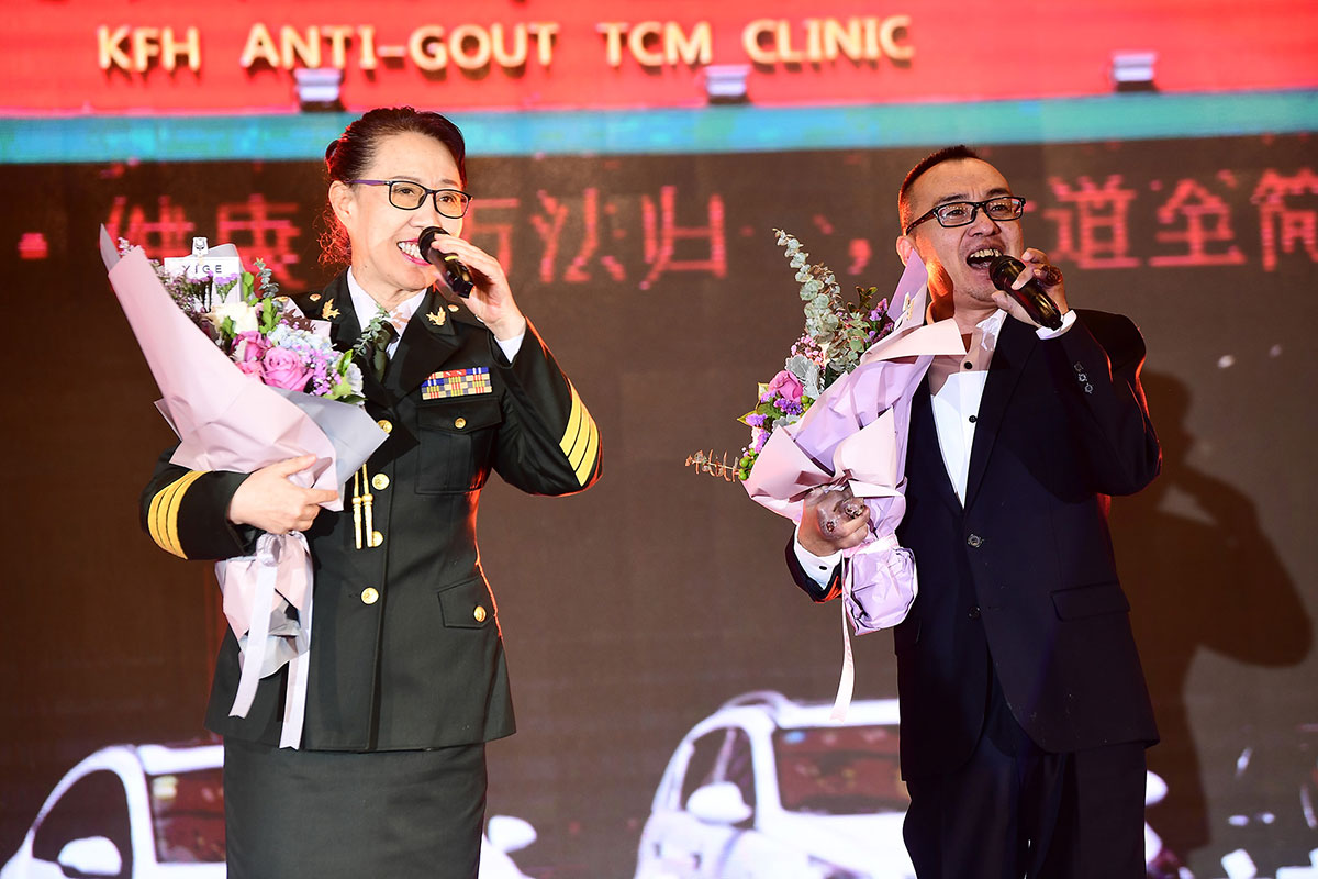 慶典現(xiàn)場(chǎng)最感人的一幕要數(shù)兩位“抗風(fēng)斗士”葛晟杰和關(guān)海強(qiáng)登臺(tái)分享一路與痛風(fēng)抗?fàn)幍男穆窔v程。他們都是風(fēng)華正茂,卻備受痛風(fēng)折磨,在遇到抗風(fēng)竤之前,幾乎都瀕臨絕望。來自山東的25歲葛晟杰,痛風(fēng)七年、癱瘓三年,經(jīng)過在抗風(fēng)竤門診的系統(tǒng)治療后,丟掉輪椅和雙拐,自己走上了舞臺(tái);關(guān)海強(qiáng)更是在被多家三甲醫(yī)院診斷“不截肢就有生命危險(xiǎn)”,并且還面臨著多臟器衰竭的風(fēng)險(xiǎn),抗風(fēng)竤醫(yī)療集團(tuán)張汭鈞董事長(zhǎng)冒著極大的風(fēng)險(xiǎn),向他伸出救助之手。如今的關(guān)海強(qiáng)不僅恢復(fù)了生命活力,而且還走上舞臺(tái)為大家吉他彈唱,重獲新生的他最想感激的就是張汭鈞董事長(zhǎng)、程莉琂總裁以及全體抗風(fēng)竤人給了他重獲健康的希望!