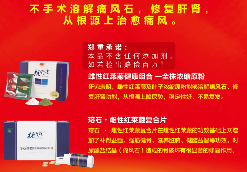 抗風(fēng)竤之所以受到市場(chǎng)如此多的關(guān)注,正是因?yàn)榭癸L(fēng)竤的產(chǎn)品優(yōu)越于藥物,綠色、安全、尊重自然,彌補(bǔ)了痛風(fēng)治療領(lǐng)域中,藥物和手術(shù)的不足,不用手術(shù)取石,避免患者受到二次傷害,其中包含以下優(yōu)勢(shì):