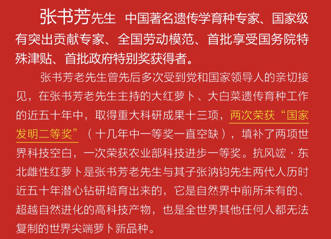 回首過往,“抗風竤”對“雌性紅萊菔暨雌性紅蘿卜”在醫(yī)療應用領域的研究、探索充滿艱辛。“雌性紅蘿卜”為我國著名遺傳學育種專家張書芳先生應用雄性不育系育種技術選育,嘔心瀝血培育而成,該項技術是國家“七五、八五攻關”重點科研項目,并榮獲“國家發(fā)明二等獎”(一等獎空缺)。